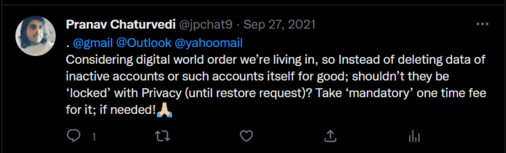 Check the below tweet that I had sent couple of years back (when I was on Twitter) to google (gmail), microsoft (outlook), yahoo (yahoomail); indirectly asking them NOT to delete emails related data, unless & until been explicitly requested by the User itself.