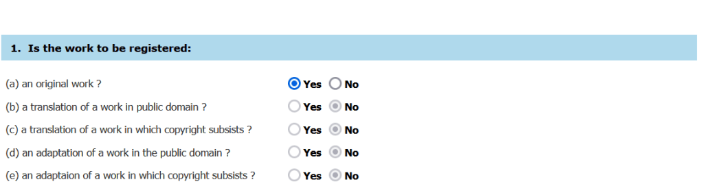 Whilst filing for the copyright, of course, one would be asked whether the work is original or translation or adaptation as shown below.
